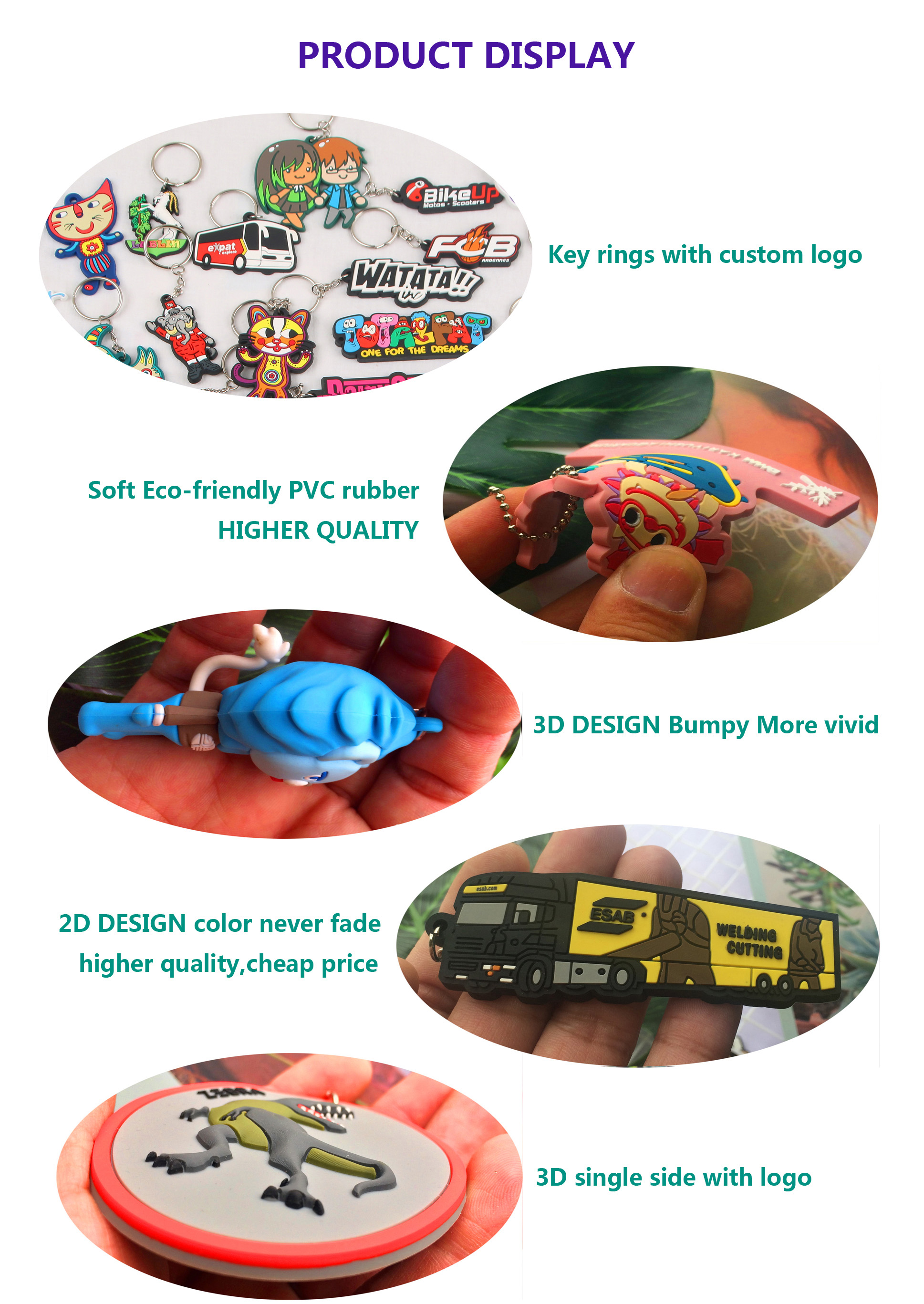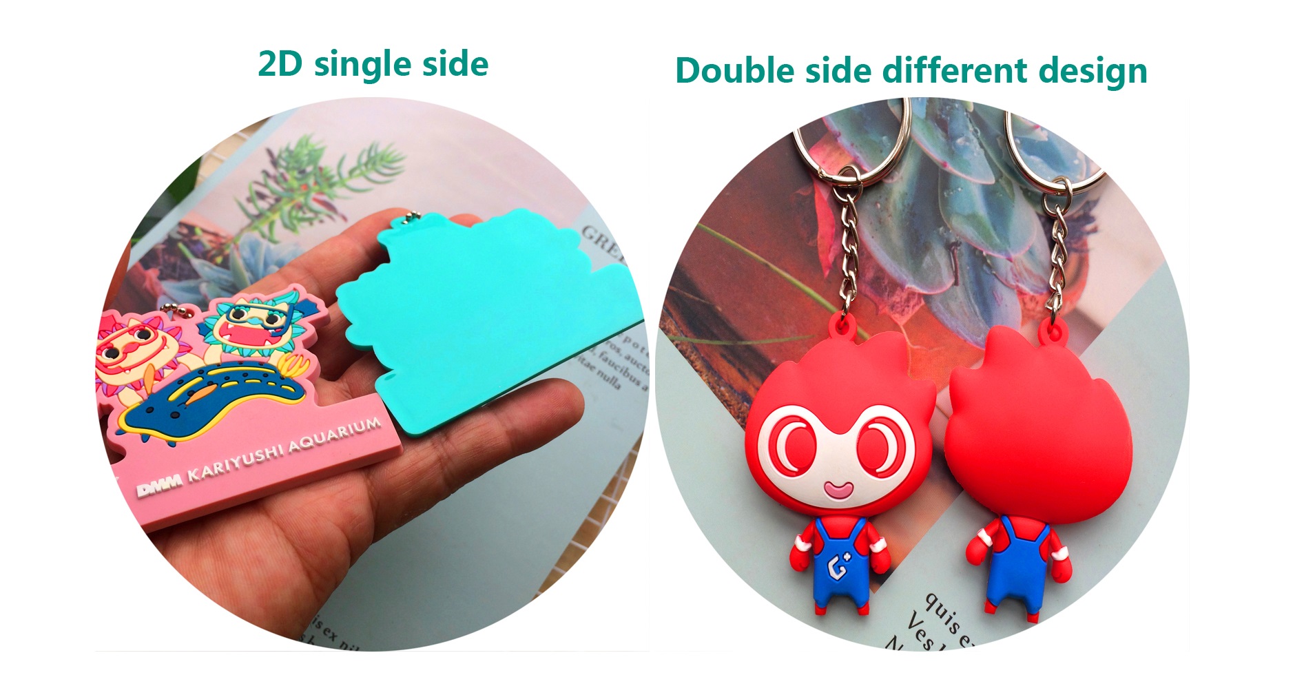 Feature: Washable, long lasting, non-fading, FLAT, 2D or 3D effect, Single Side, Double Side, or Full 3D PVC Keychain, Soft eco-friendly PVC rubber
