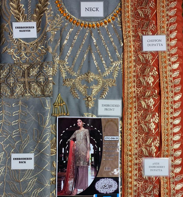 Chiffon fully heavy embroidered spangle work front with fully handwork & embellishment neck mala with heavily embroidered daman border & daman tulses